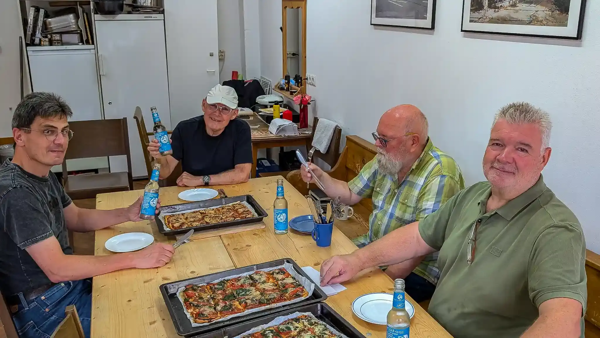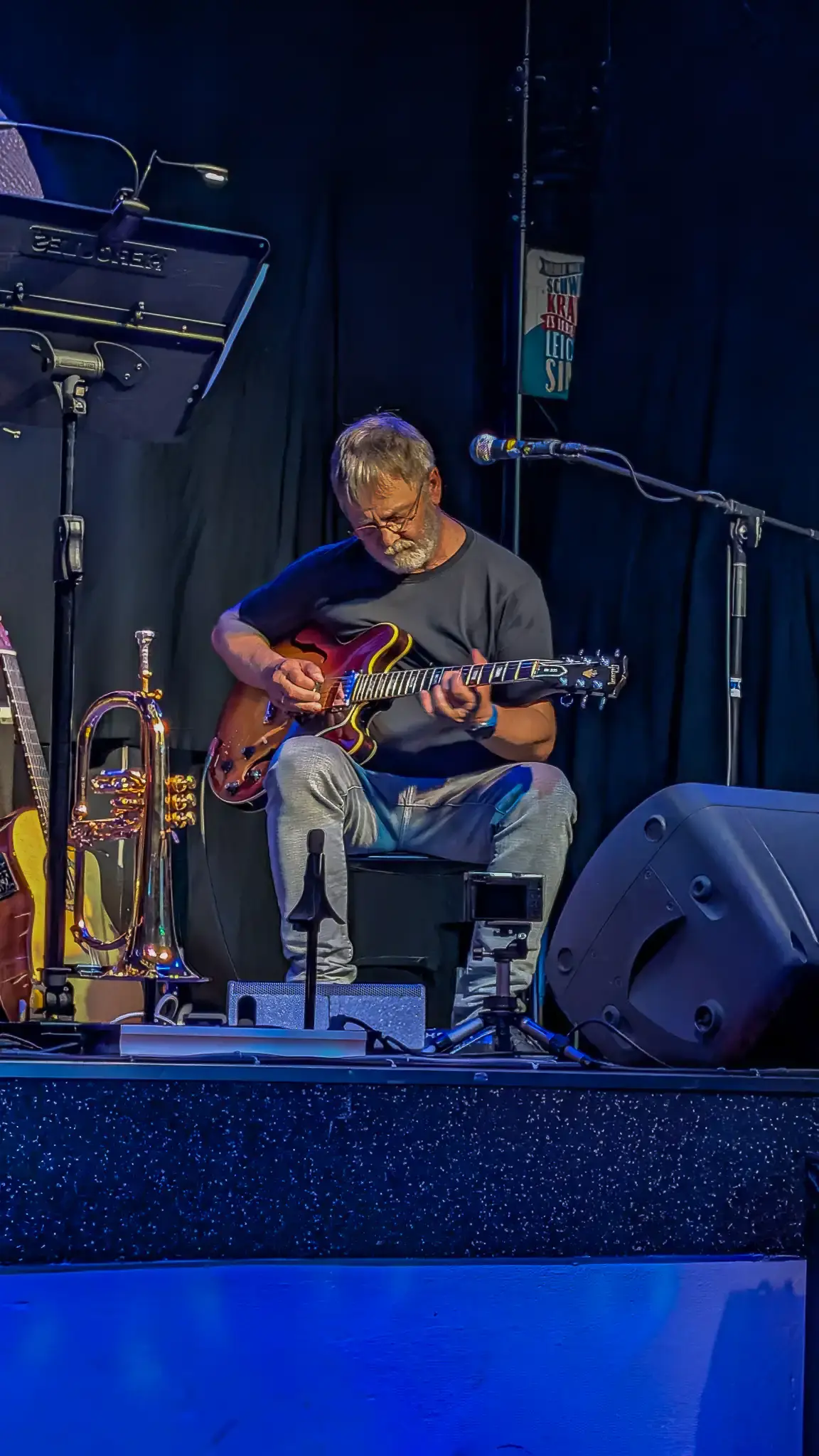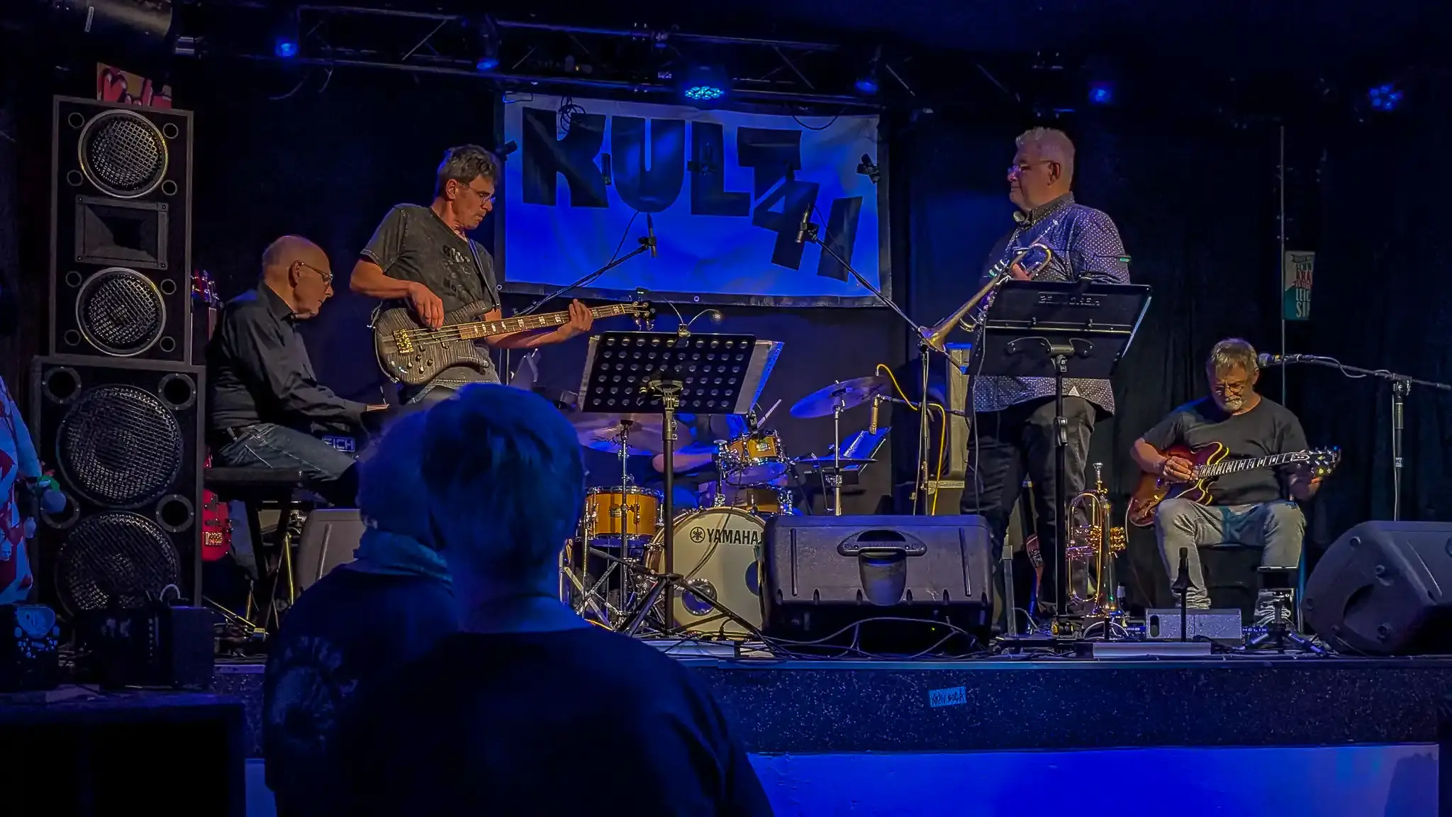 >01.08.2025Es war eine Herausforderung, im Kult41 in Bonn zu spielen. Der Spielort mit über 200 Konzerten im Jahr(!) konzentriert sich eigentlich mehr auf Rock-, Punk- und Independent-Auftritte. Auch die Spielstätte, eine kleine Halle mit einer alten Laderampe als doch recht hoher Bühne hatte ihre akustischen Eigenheiten. Es gab einen herzlichen Empfang durch Uwe Sarter, der uns eingeladen hatte. Vor dem Konzert lud er uns erstmal Backstage zum Essen der selbstgebackenen Pizza ein. Der Soundcheck mit Wolfgang vom Kult41 hatte dann etwas Geduld abverlangt, doch beim Konzert klappte alles bestens. Das neue Programm der Band wartet neben den Swingnummern vermehrt mit erdigen Sounds aus Funk, Blues und Jazzrock auf. So legte Trompeter Rainer Matz mit Schlagzeuger Martin Christophery bei "St. Thomas" ein spektakuläres Frage-Antwortspiel hin, indem er mit seinem Mikro im "Beatbox"-Style improvisierte. Aber auch sonst gab es viele spontane Nuancen im Spiel und die den Jazzis stets eigene Spielfreude zeigte sich bei Peter Hünnemeyer in seinen virtuosen perligen Improvisationsläufen, Jörg Faust in kreativen Anschlagstechniken am Bass und Stefan Weigelt mit stets variablem Gitarrenspiel an Jazz- und Akustikgitarre wieder einmal in besonderer Weise. Der Funke sprang spätestens nach der Pause komplett über und umso schöner, dass die Jazzis die Leute zum Schluss bei den letzten vier Stücken des Konzertes sogar auf der Tanzfläche sehen konnten. Zwei Zugaben wurden noch abverlangt, bevor die ordnungsrechtliche Deadline den offiziellen Konzertabend beendete. Das Publikum und die Veranstalter konnten wir restlos begeistern und bekamen von allen Seiten positive Rückmeldungen. Eine mittelfristige Wiederholung ist fest vorgesehen. Wir bedanken uns bei Uwe für die Einladung, Wolfgang für den Sound und den netten Leuten am Einlass und an der Theke für den herzlichen Umgang und kommen natürlich gerne einmal wieder!