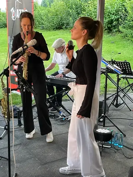 >09.08.2023Wenn doch alle Veranstalter so wären wie die Leute vom KUKloch in Witten ? dann könnten wir immer so entspannt auf die Bühne gehen, wie beim Gartenkonzert am 9. August 2023. Schon das Anliefern des ganzen Equipments war entspannt, da wir nicht weit schleppen mussten und unsere Autos ohne umständliche Suche parken konnten. Dann konnten wir in aller Ruhe und mit viel Platz unter den großzügigen Sonnenschirmen aufbauen und hatten genügend Zeit für einen ausgiebigen Soundcheck mit unserem Liebingsmixer Marcus Schröer. Während das Publikum eintraf, durften wir uns in die Küche zurückziehen, wo liebevoll zubereitete Schnittchen und leckere Getränke auf uns warteten. In einem kurzen Interview mit einer der Organisatorinnen erzählten wir die JAZZIS-Geschichte, was dann zu einer freundlichen und humorvollen Begrüßung der Band führte. Obwohl es mitten in der Woche war, kamen mehr als 70 Gäste, die uns konzentriert zuhörten und am Ende mit Standing Ovations verabschiedeten. Wunderschön war?s im KUKloch, wir haben eure Gastfreundschaft sehr genossen. Danke an Dieter Fender und sein großartiges Team!