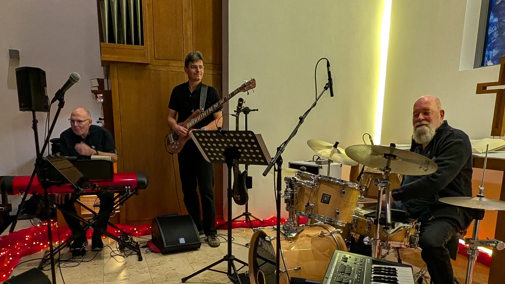 >10.11.2024Ohne die leider erkrankte Dorothee spielten wir als Quintett bei der ev. Kirchengemeinde Balve mal wieder im Sauerland. Die Gemeinde etabliert dort gerade einen Konzertreihe. In der liebevollen Umgebung wurden wir herzlichst von Silke Hoppe und Gemeindereferent Sven Körber empfangen. Mit dem wie immer genialen Sound von Marcus Schröer konnten wir die gut gefüllte Kirche schnell für uns gewinnen und wurden zum Ende nach der Zugabe - bei der wir einige der Gäste sogar zum Tanzen animieren konnten - mit Standing Ovations bedacht. Am Rande gab es nette Gespräche und wir hoffen, auch bald mal wieder nach Balve kommen zu dürfen! Die Hönne-Zeitung schrieb hier einen Bericht.