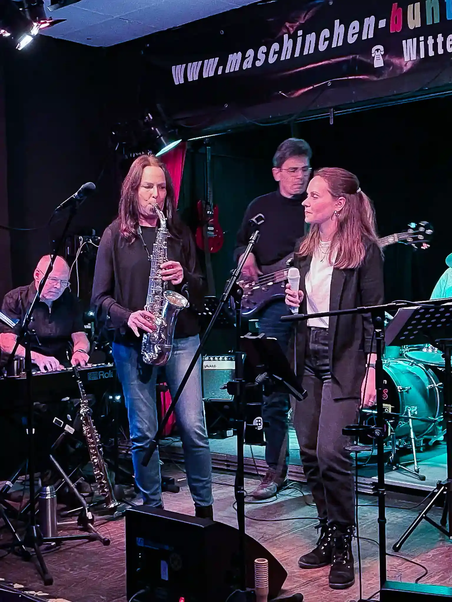 >24.01.2025Wieder einmal eröffneten wir unsere Konzertsaison im Maschinchen Buntes in Witten. Hier haben wir uns sogar schon eine kleine Fanbase erarbeitet. Vor gut gefülltem Hause ließ man uns erst nach drei Zugaben von der Bühne, am Ende stieg Sylvie Werse noch mit ein. Unser spezieller Dank geht an Gerald Caspers für den super Sound und an das gesamte Team vom Maschinchen! Für die Jazzis endet hiermit der nächste Abschnitt der Bandgeschichte, denn Geli Goldschmidt und Dorothee Pilavas werden die Band verlassen. Wir danken beiden und wünschen ihnen alles Gute für ihre musikalische und private Zukunft. Bereits beim nächsten Konzert am 1. Februar 2025 im Cafe Alt Wien in Dortmund-Brackel wird die Band als Quartett und möglicherweise schon mit einem neuen Saxofonspieler und Sänger auftreten. Die Jazzis 3.0 formieren sich neu!